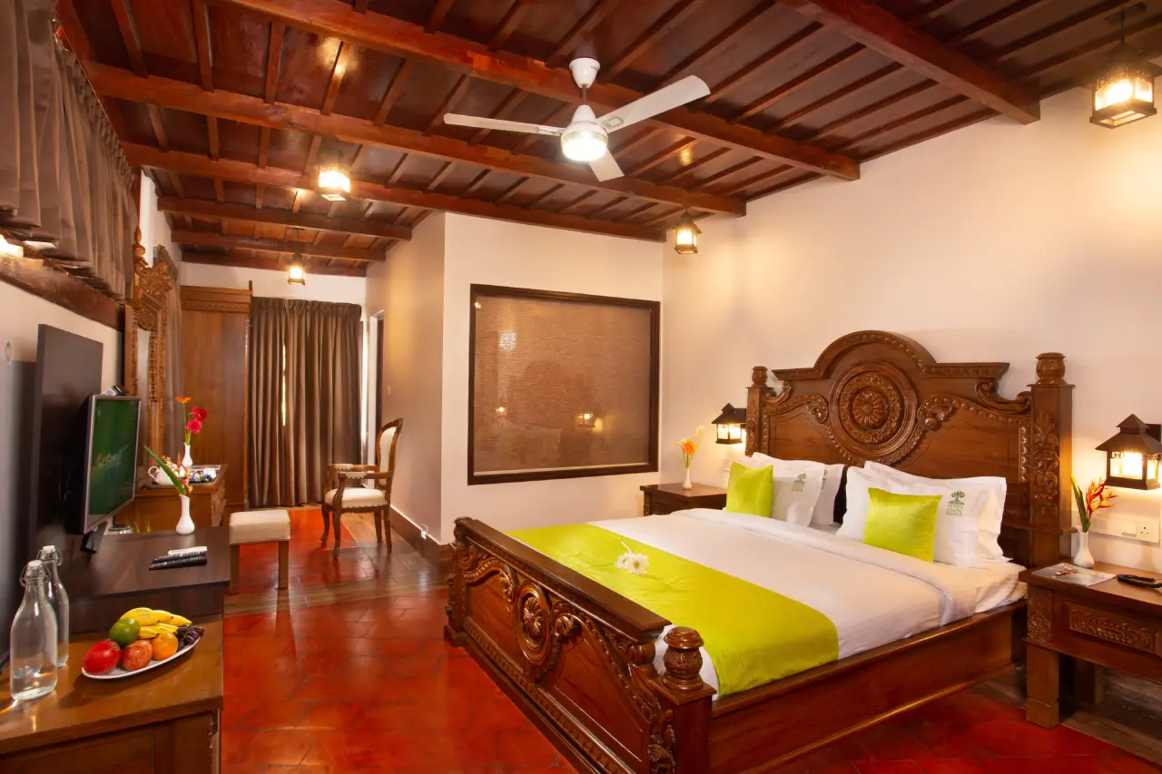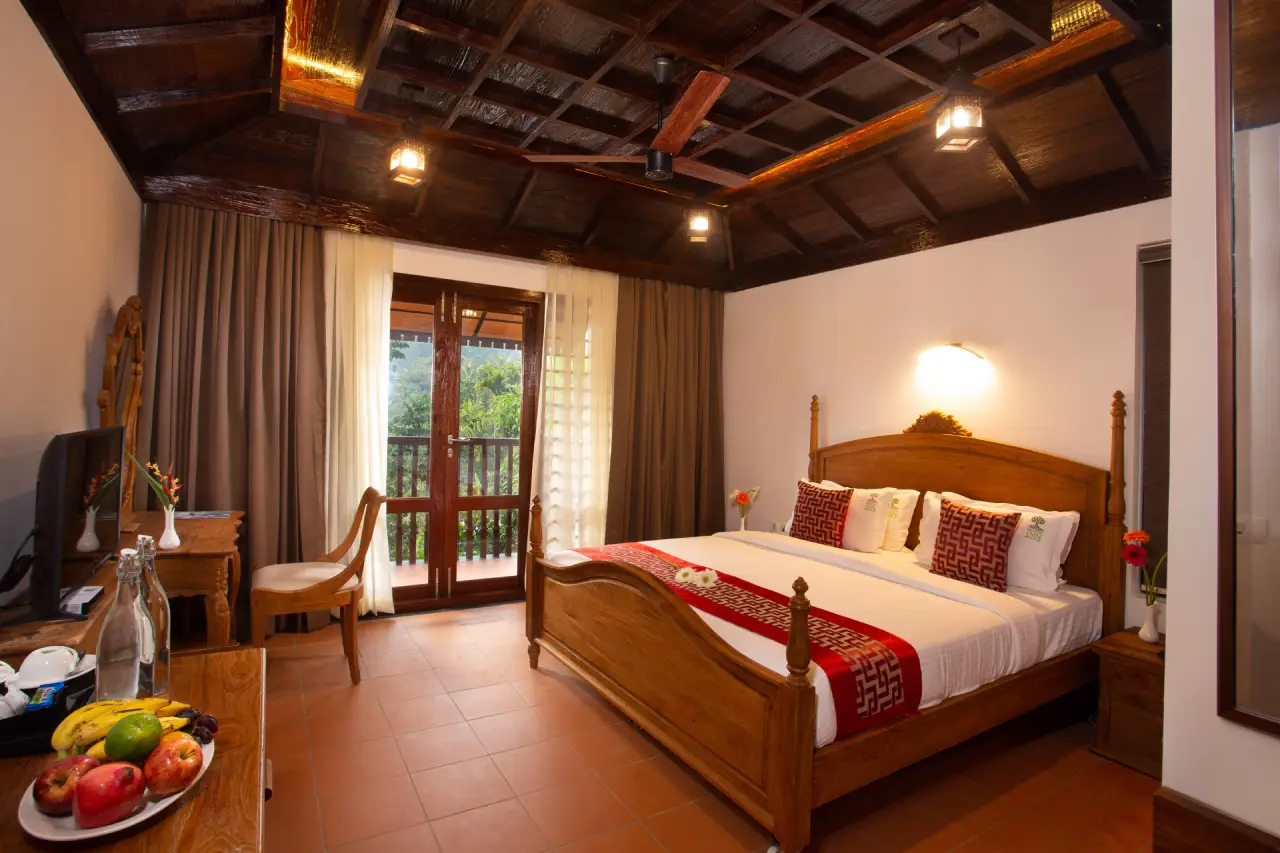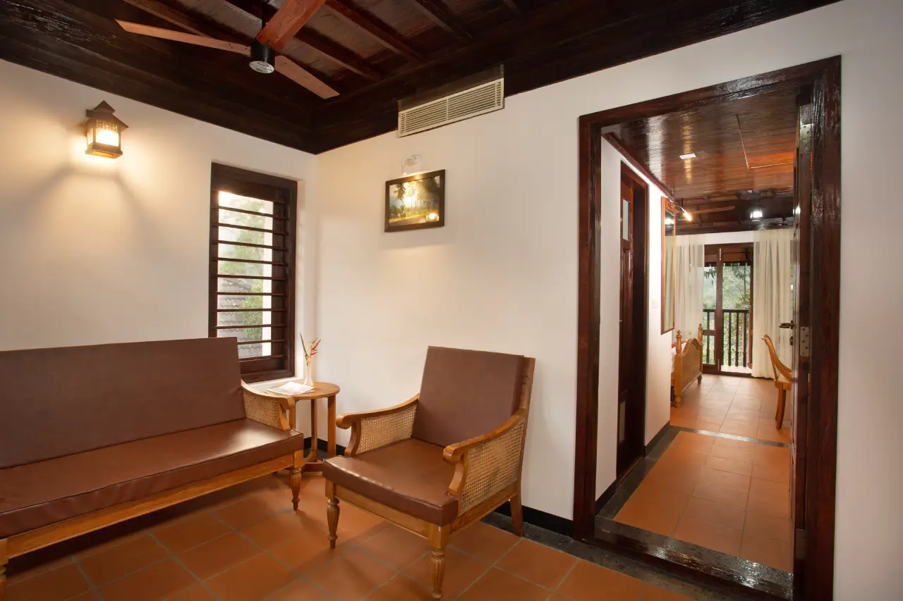 These rooms at Heaven Inn Munnar, a premier luxury resort in Munnar, are designed to offer spectacular views of the rolling mountains and surrounding forests. Built following traditional Kerala architecture, each room features authentic wooden ceilings and carefully crafted teak wood furniture in the elegant Travancore style, combining timeless heritage with modern comfort for an unforgettable stay.